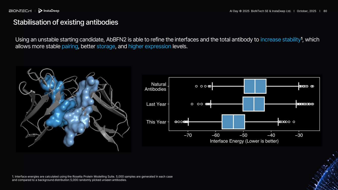Using an unstable starting candidate, AbBFN2 is able to refine the interfaces and the total antibody to increase stability1, which allows more stable pairing, better storage, and higher expression levels. Stabilisation of existing antibodies 1. Interface energies are calculated using the Rosetta Protein Modelling Suite. 5,000 samples are generated in each case and compared to a background distribution 5,000 randomly picked unseen antibodies. AI Day © 2025 BioNTech SE & InstaDeep Ltd. I October, 2025 I 80