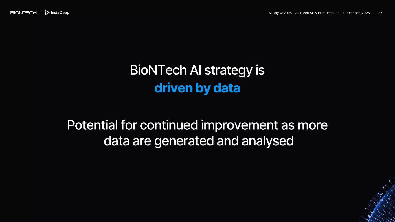 driven by data Potential for continued improvement as more data are generated and analysed BioNTech AI strategy is AI Day © 2025 BioNTech SE & InstaDeep Ltd. I October, 2025 I 87