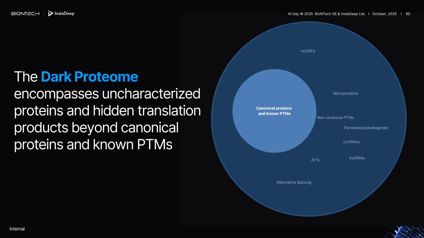 Internal AI Day © 2025 BioNTech SE & InstaDeep Ltd. I October, 2025 I 90 The Dark Proteome encompasses uncharacterized proteins and hidden translation products beyond canonical proteins and known PTMs