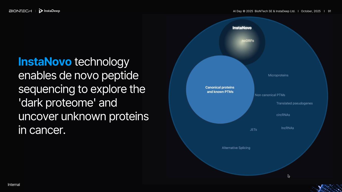 InstaNovo technology enables de novo peptide sequencing to explore the 'dark proteome' and uncover unknown proteins in cancer. Internal AI Day © 2025 BioNTech SE & InstaDeep Ltd. I October, 2025 I 91