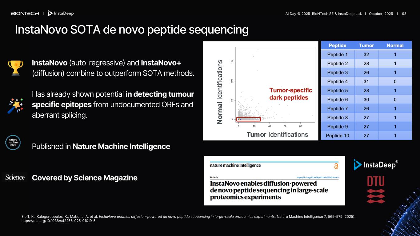 Database searchReference library JETs lncRNAs Known Dark Tumor Antigens (dTAs) TMDPKTGYQ TAYEPTTFW ATGPVMPTR MS2 spectra TMDPKTGYQ GARVEMEYR ATGPVMPTR All Possible Peptides Incl. any unanticipated targets TAYEPTTFW SWHADEQV IGEYKTSLS … InstaNovo’s library-free approach allows discovery of unanticipated dark proteome antigens AI Day © 2025 BioNTech SE & InstaDeep Ltd. I October, 2025 I 92