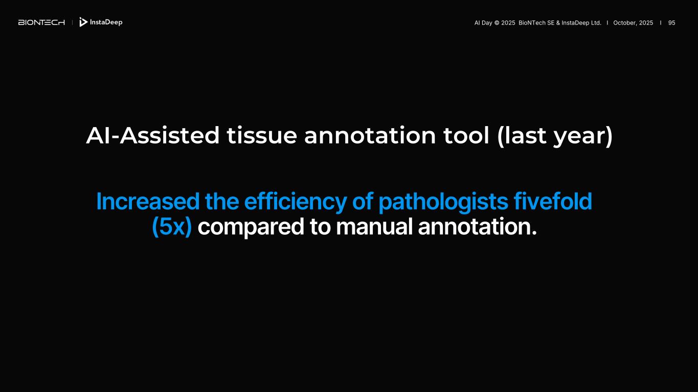 AI-Assisted tissue annotation tool (last year) Increased the efficiency of pathologists fivefold (5x) compared to manual annotation. AI Day © 2025 BioNTech SE & InstaDeep Ltd. I October, 2025 I 95