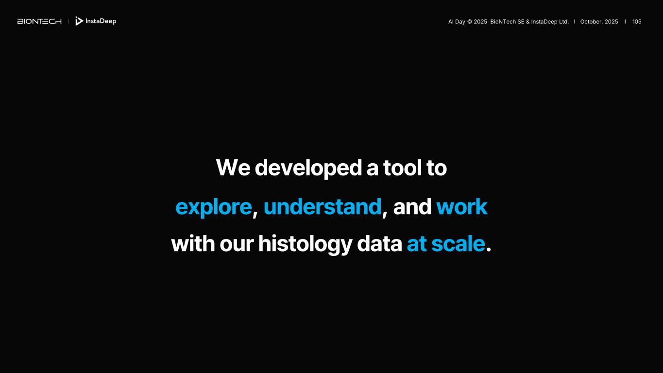 We developed a tool to explore, understand, and work with our histology data at scale. AI Day © 2025 BioNTech SE & InstaDeep Ltd. I October, 2025 I 105