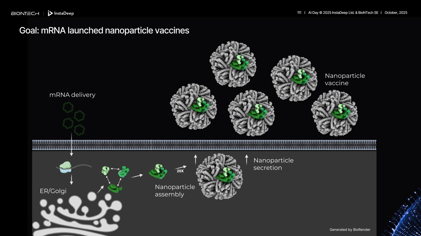 111 I AI Day © 2025 InstaDeep Ltd. & BioNTech SE I October, 2025 Goal: mRNA launched nanoparticle vaccines mRNA delivery ER/Golgi Nanoparticle assembly Nanoparticle secretion Nanoparticle vaccine Generated by BioRender