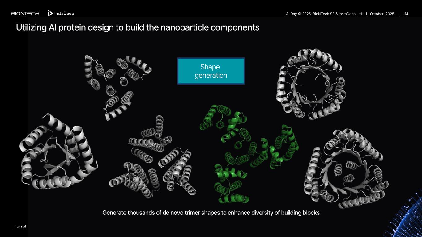 Shape generation Generate thousands of de novo trimer shapes to enhance diversity of building blocks Utilizing AI protein design to build the nanoparticle components Internal AI Day © 2025 BioNTech SE & InstaDeep Ltd. I October, 2025 I 114