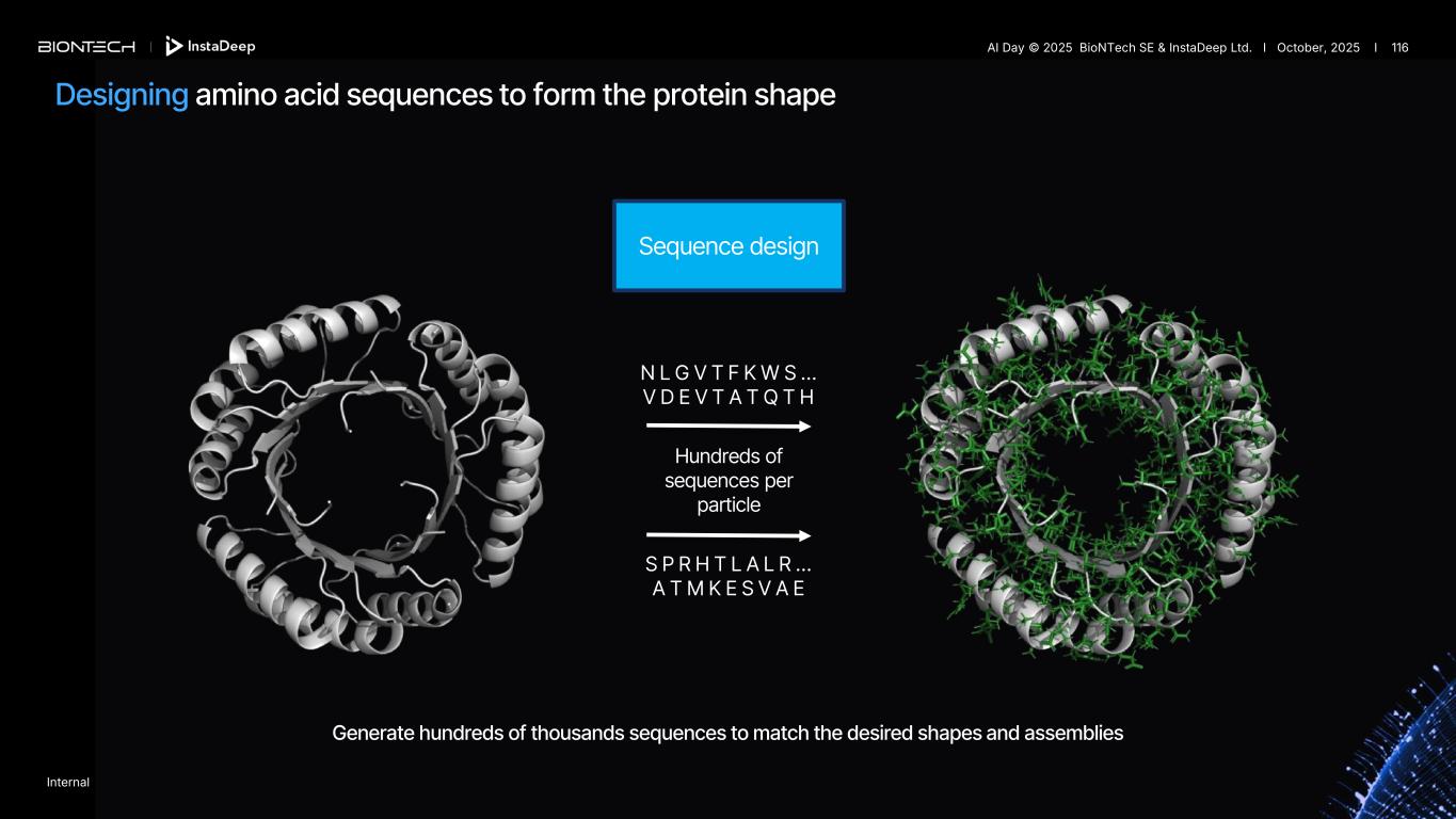 Sequence design Generate hundreds of thousands sequences to match the desired shapes and assemblies N L G V T F K W S … V D E V T A T Q T H Hundreds of sequences per particle S P R H T L A L R … A T M K E S V A E Designing amino acid sequences to form the protein shape Internal AI Day © 2025 BioNTech SE & InstaDeep Ltd. I October, 2025 I 116