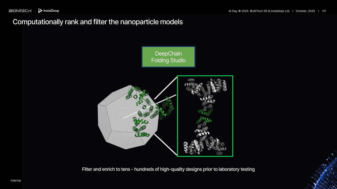 DeepChain Folding Studio Filter and enrich to tens - hundreds of high-quality designs prior to laboratory testing Computationally rank and filter the nanoparticle models Internal AI Day © 2025 BioNTech SE & InstaDeep Ltd. I October, 2025 I 117