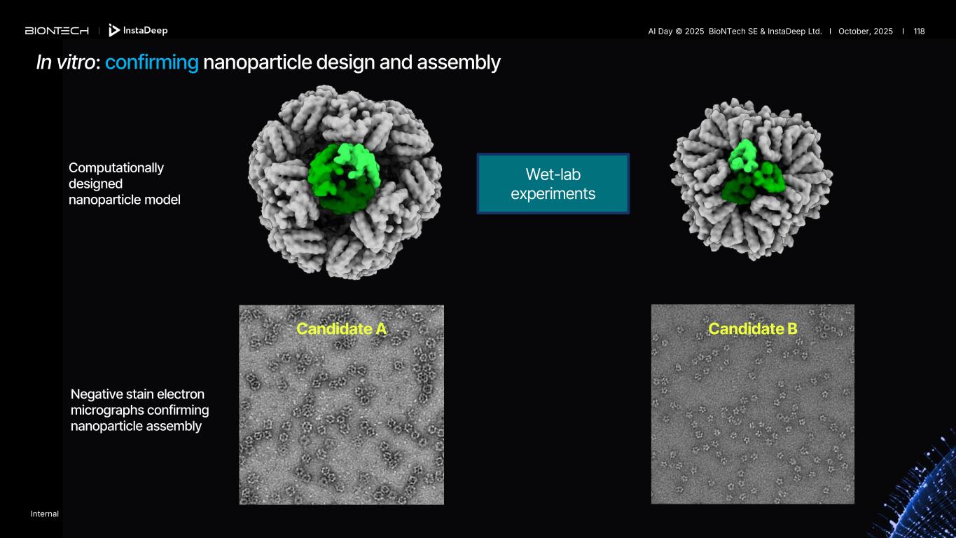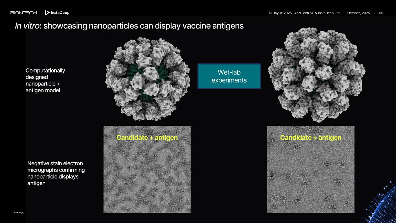 Negative stain electron micrographs confirming nanoparticle assembly Computationally designed nanoparticle model Candidate A Wet-lab experiments Candidate B In vitro: confirming nanoparticle design and assembly Internal AI Day © 2025 BioNTech SE & InstaDeep Ltd. I October, 2025 I 118