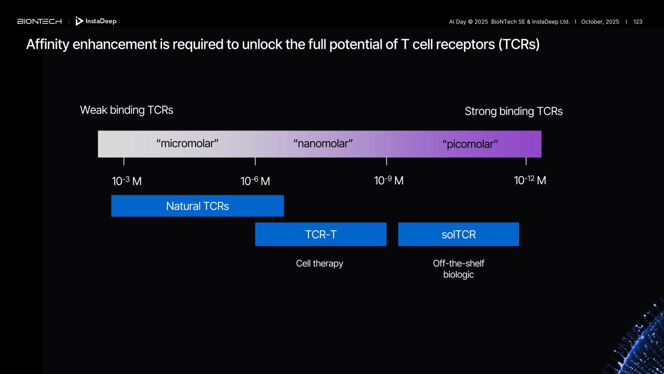 Affinity enhancement is required to unlock the full potential of T cell receptors (TCRs) TCR-T solTCR 10-3 M 10-6 M 10-9 M 10-12 M “micromolar” “nanomolar” “picomolar” Weak binding TCRs Strong binding TCRs Natural TCRs Cell therapy Off-the-shelf biologic AI Day © 2025 BioNTech SE & InstaDeep Ltd. I October, 2025 I 123