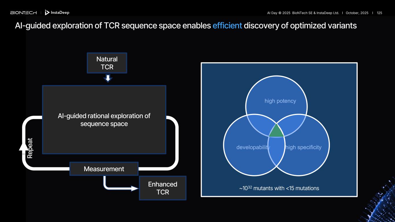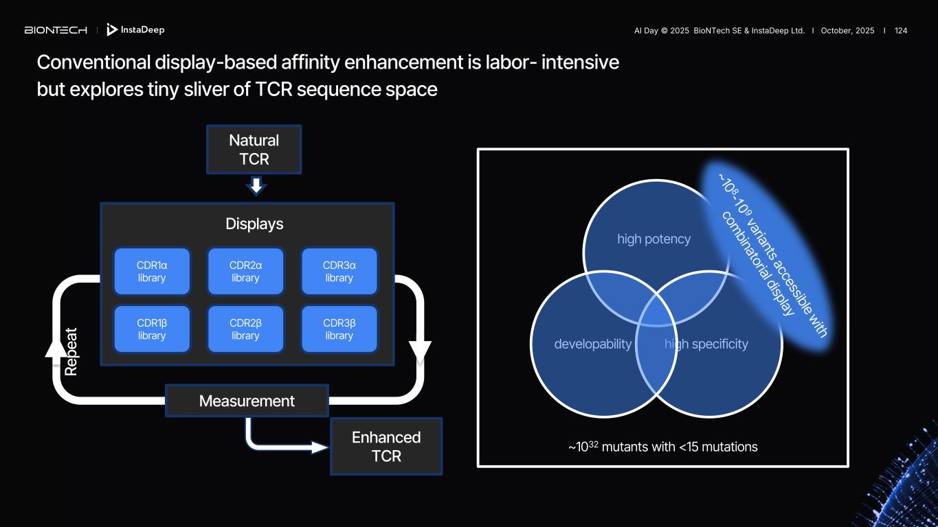 Conventional display-based affinity enhancement is labor- intensive but explores tiny sliver of TCR sequence space CDR1α library CDR2α library CDR3α library CDR1β library CDR2β library CDR3β library Displays Measurement Re pe at Natural TCR Enhanced TCR developability high potency high specificity ~1032 mutants with <15 mutations AI Day © 2025 BioNTech SE & InstaDeep Ltd. I October, 2025 I 124
