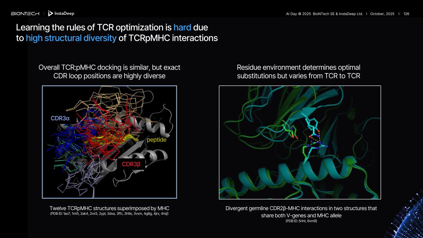 AI-guided exploration of TCR sequence space enables efficient discovery of optimized variants AI-guided rational exploration of sequence space Measurement Re pe at Natural TCR Enhanced TCR ~1032 mutants with <15 mutations developability high potency high specificity AI Day © 2025 BioNTech SE & InstaDeep Ltd. I October, 2025 I 125