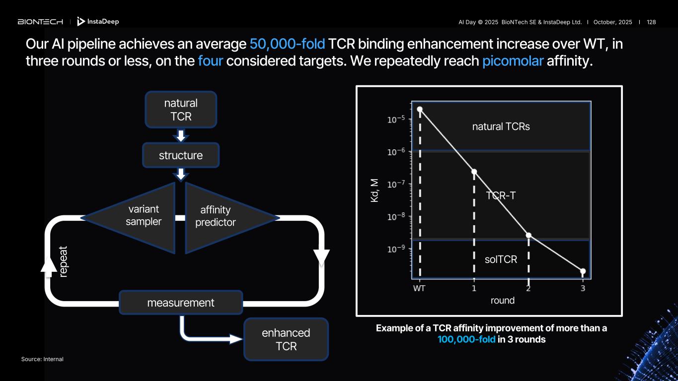 solTCR natural TCRs TCR-T measurement re pe at natural TCR enhanced TCR round K d, M variant sampler affinity predictor structure Source: Internal Example of a TCR affinity improvement of more than a 100,000-fold in 3 rounds Our AI pipeline achieves an average 50,000-fold TCR binding enhancement increase over WT, in three rounds or less, on the four considered targets. We repeatedly reach picomolar affinity. AI Day © 2025 BioNTech SE & InstaDeep Ltd. I October, 2025 I 128
