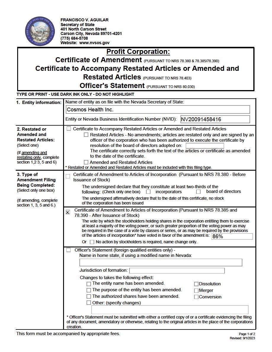 CERTIFICATE OF AMENDMENT TO THE ARTICLES OF INCORPORATION OF COSMOS HEALTH INC.
