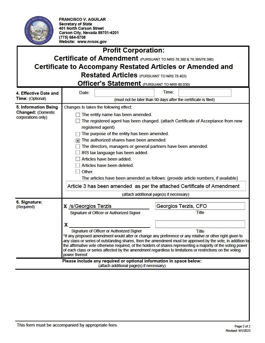III. | EFFECTIVE DATE OF FILING. This Certificate of Amendment to the Articles of Incorporation shall be effective on September 30, 2025. |
