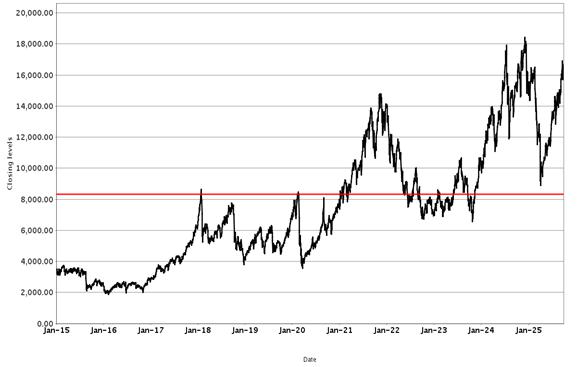 The following graph sets forth hypothetical back-tested and historical closing values of the Underlier for the period from January 1, 2015 to September 30, 2025. The Underlier was launched on December 9, 2024. Accordingly, all closing values for periods prior to the launch date are based on hypothetical back-tested information, utilizing the same methodology as is currently in place for the Underlier. The hypothetical back-tested performance of the Underlier is based on criteria that have been applied retroactively with the benefit of hindsight; these criteria cannot account for all financial risk that may affect the actual performance of the Underlier in the future. The future performance of the Underlier may vary significantly from the hypothetical back-tested and historical performance illustrated in the graph below.