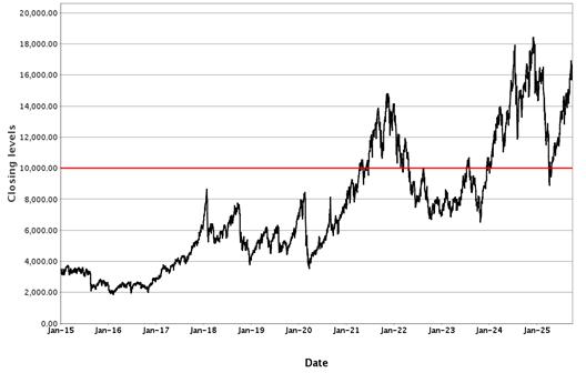 The following graph sets forth hypothetical back-tested and historical closing values of the Underlier for the period from January 1, 2015 to September 30, 2025. The Underlier was launched on December 9, 2024. Accordingly, all closing values for periods prior to the launch date are based on hypothetical back-tested information, utilizing the same methodology as is currently in place for the Underlier. The hypothetical back-tested performance of the Underlier is based on criteria that have been applied retroactively with the benefit of hindsight; these criteria cannot account for all financial risk that may affect the actual performance of the Underlier in the future. The future performance of the Underlier may vary significantly from the hypothetical back-tested and historical performance illustrated in the graph below.