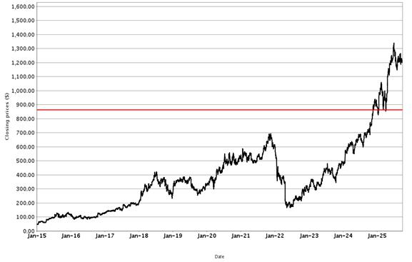 The following graph sets forth historical closing values of the Underlier for the period from January 1, 2015 to September 30, 2025. The red line represents the Coupon Threshold and Barrier Value. We obtained the information in the graph from Bloomberg Financial Markets, without independent investigation. We cannot give you assurance that the performance of the Underlier will result in the return of all of your initial investment.