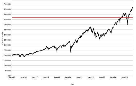 The following graph sets forth historical closing values of the Underlier for the period from January 1, 2015 to September 30, 2025. The red line represents the Buffer Value. We obtained the information in the graph from Bloomberg Financial Markets, without independent investigation. We cannot give you assurance that the performance of the Underlier will result in the return of all of your initial investment.