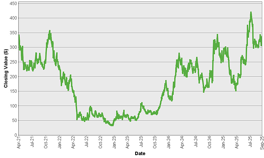 The closing value of Coinbase Global, Inc. on September 30, 2025 was $337.49.