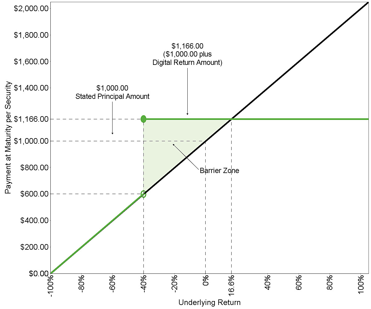 $166.00 per security (representing a digital return equal to 16.60% of the stated principal amount). You will receive the digital return amount only if the final underlying value is greater than or equal to the final barrier value. |