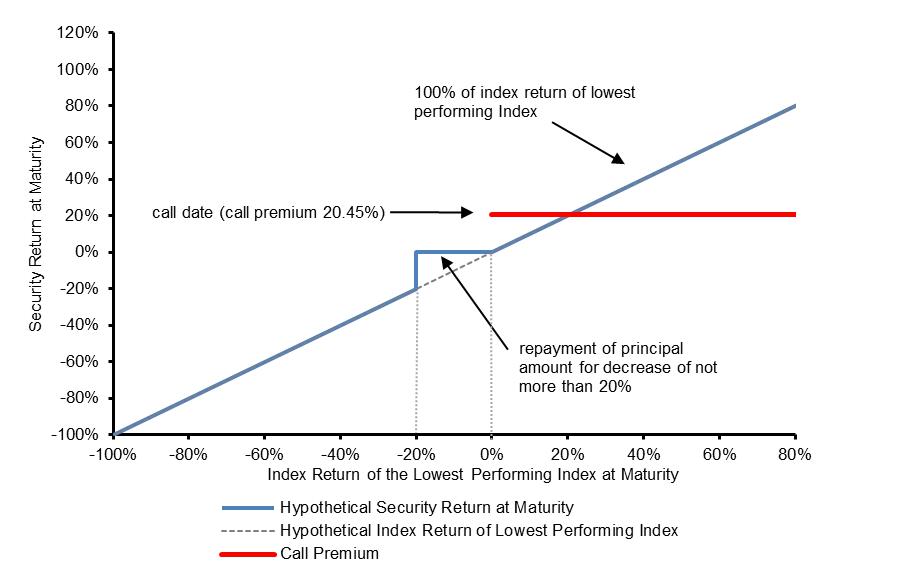Because the hypothetical closing level of the lowest performing Index on the call date is greater than its hypothetical starting level, the securities are automatically called on the call date and you will receive on the call settlement date the principal amount of your securities plus the call premium of 20.45% of the principal amount. Even though the lowest performing Index appreciated by 30.00% from its hypothetical starting level to its hypothetical closing level on the call date in this example, your return is limited to the call premium of 20.45%.