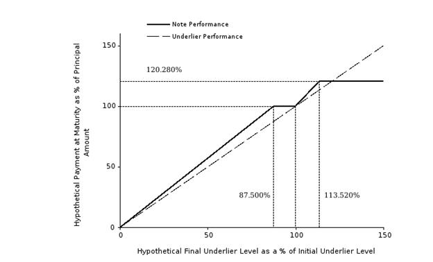 The following chart also shows a graphical illustration of the hypothetical payments at maturity (expressed as a percentage of the principal amount of your notes) that we would pay on your notes on the stated maturity date, if the final underlier level (expressed as a percentage of the initial underlier level) were any of the hypothetical levels shown on the horizontal axis. The chart shows that any hypothetical final underlier level (expressed as a percentage of the initial underlier level) of less than 87.500% (the section left of the 87.500% marker on the horizontal axis) would result in a hypothetical payment at maturity of less than 100.000% of the principal amount of your notes (the section below the 100.000% marker on the vertical axis) and, accordingly, in a loss of principal to the holder of the notes. The chart also shows that any hypothetical final underlier level (expressed as a percentage of the initial underlier level) of greater than or equal to 113.520% (the section right of the 113.520% marker on the horizontal axis) would result in a capped return on your investment.