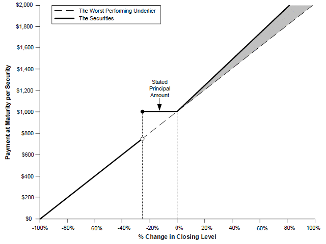 The payment at maturity will be based solely on the performance of the worst performing underlier, which could be either underlier. The payoff diagram and table below illustrate the payment at maturity for a range of hypothetical performances of the worst performing underlier over the term of the securities.