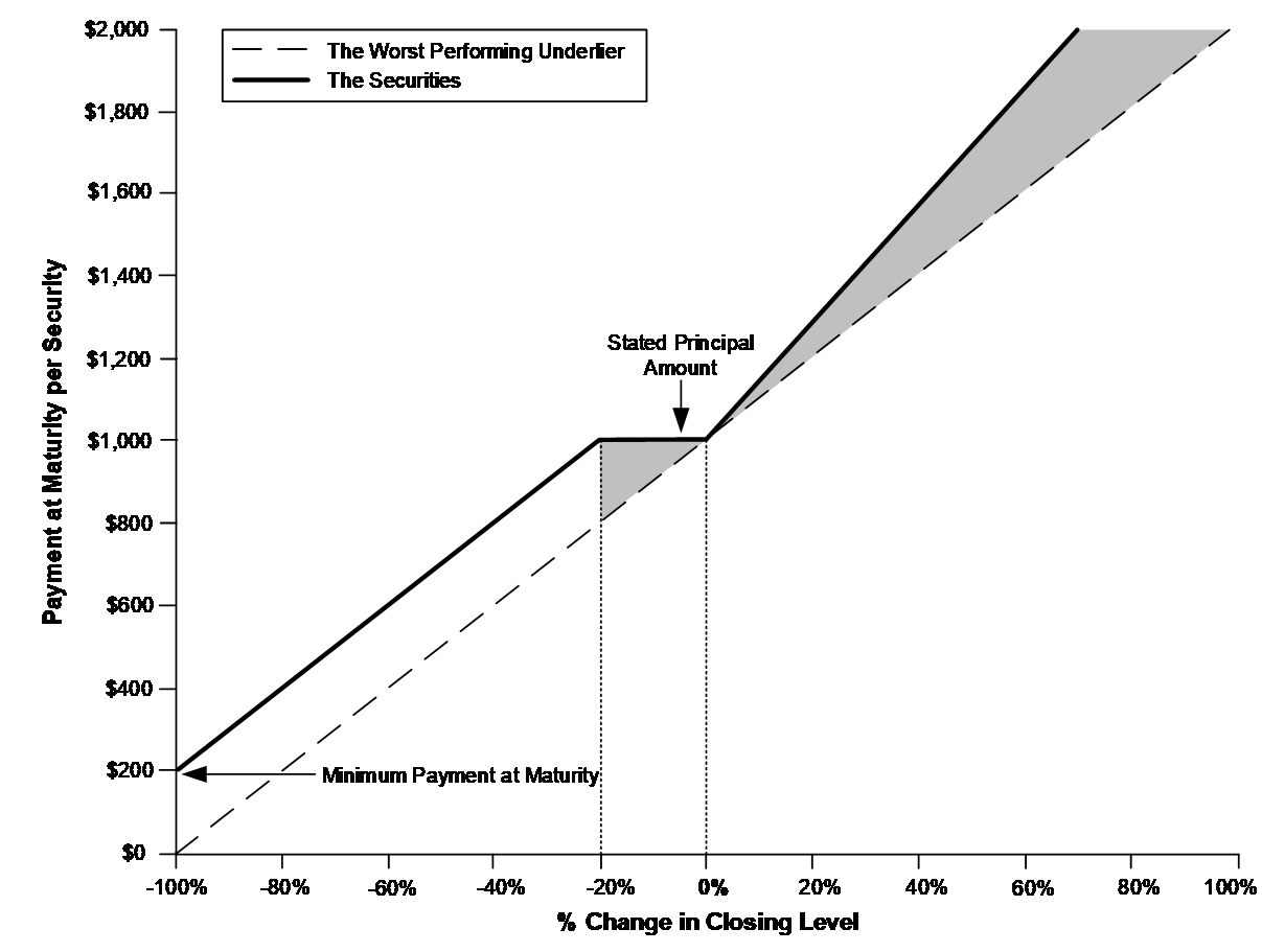 The payment at maturity will be based solely on the performance of the worst performing underlier, which could be any underlier. The payoff diagram and table below illustrate the payment at maturity for a range of hypothetical performances of the worst performing underlier over the term of the securities.