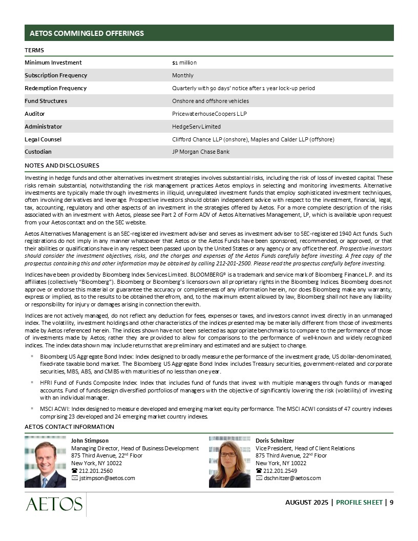 Custodian JP Morgan Chase Bank Aetos Commingled offerings Aetos Contact Information John Stimpson Managing Director, Head of Business Development 875 Third Avenue, 22nd Floor New York, NY 10022 ( 212.201.2560 *