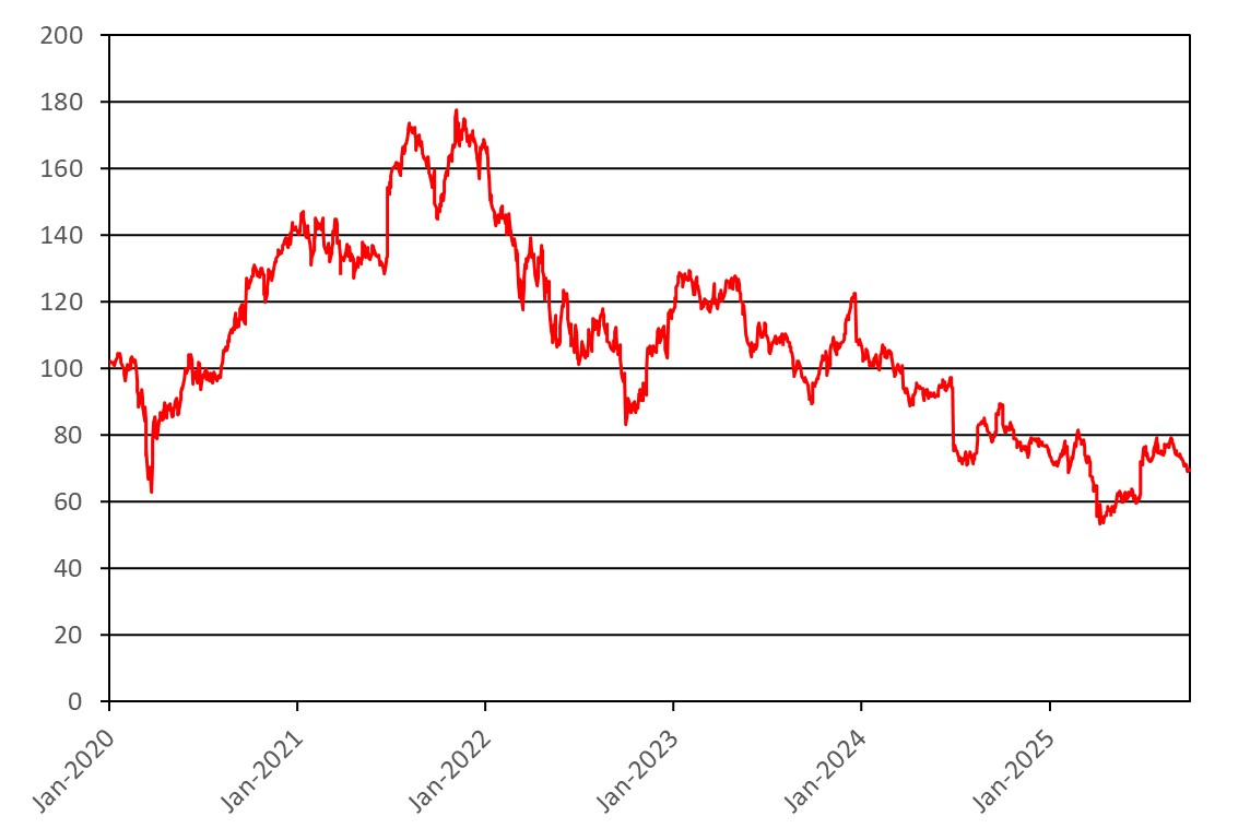 We obtained the information regarding the historical performance of the reference asset in the graph below from Bloomberg, without independent review or verification. The graph below illustrates the performance of the reference asset from January 1, 2020 through September 30, 2025. The closing price of the reference asset on September 30, 2025 was $69.73.