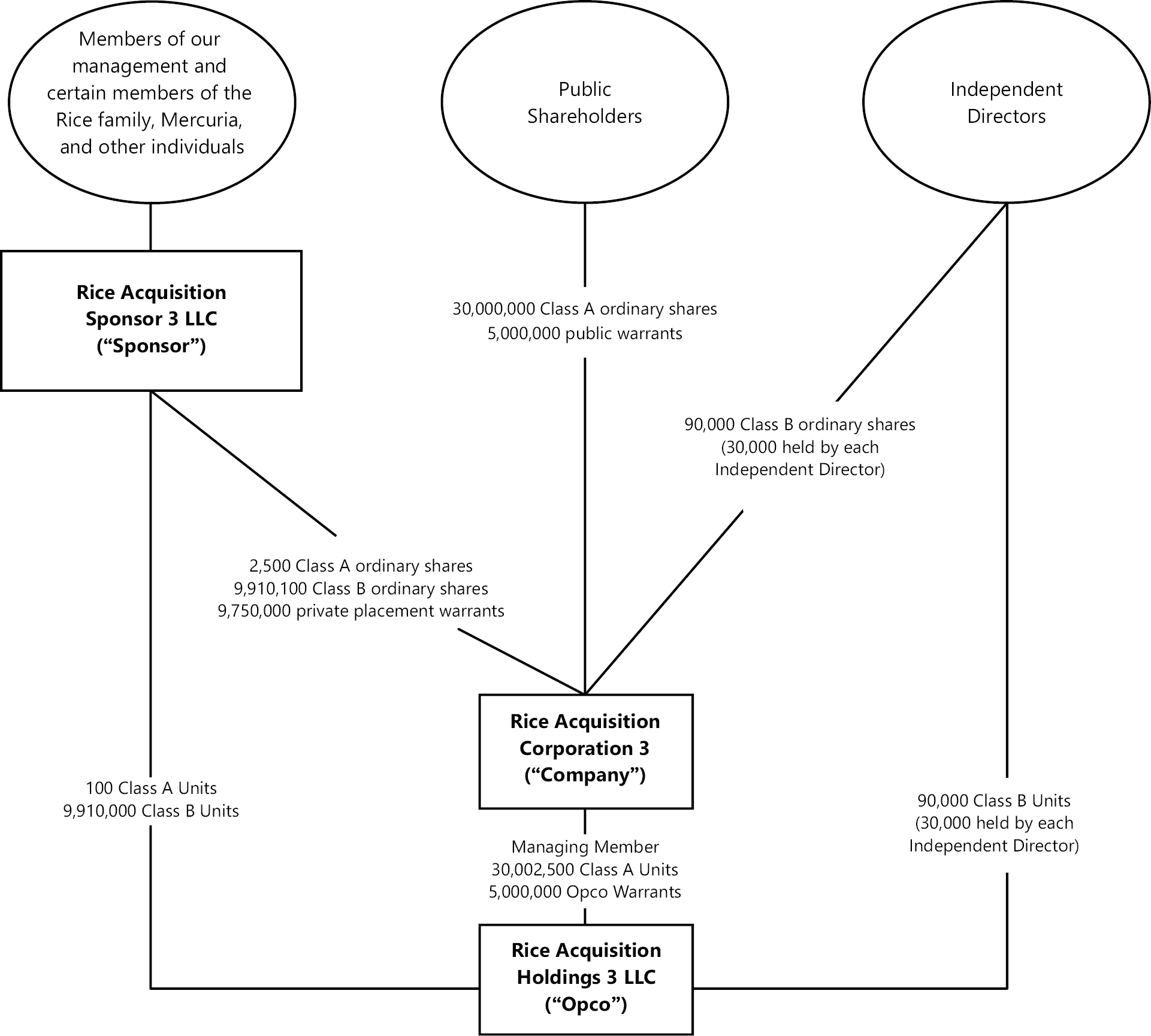 Our initial shareholders, which include our sponsor, currently own 11,500,100 Class B ordinary shares (up to 1,500,000 of which are subject to forfeiture depending on the extent to which the underwriters’ over-allotment option is exercised), 11,500,000 Class B units of Rice Acquisition Holdings 3 LLC (“Opco”) (up to 1,500,000 of which are subject to forfeiture depending on the extent to which the underwriters’ over-allotment option is exercised), 100 Class A units of Opco and 2,500 Class A ordinary shares. The Class B units of Opco are expected to convert into Class A units of Opco in connection with, or in certain circumstances described in the Opco LLC Agreement (as defined herein) at specified times after, our initial business combination on a one-for-one basis, subject to adjustment as provided herein. We refer to the Class B units of Opco (or the Class A units of Opco into which such Class B units are expected to convert), together with a corresponding number of our Class B ordinary shares, collectively as the “founder securities,” and we refer to the Class A units of Opco, together with a corresponding number of our Class B ordinary shares, and the 2,500 Class A ordinary shares purchased by our sponsor in a private placement prior to this offering collectively as the “sponsor securities.” The Class A units of Opco that comprise the founder securities and sponsor securities will be exchangeable (together with the cancellation of a corresponding number of our Class B ordinary shares) for our Class A ordinary shares after the completion of our initial business combination on a one-for-one basis, subject to adjustment as provided herein. Each Class B ordinary share has no economic rights but entitles its holder to one vote. Prior to the completion of our initial business combination, only holders of our Class B ordinary shares will be entitled to vote on the appointment of directors or in a vote to transfer the company by way of continuation in a jurisdiction outside the Cayman Islands.