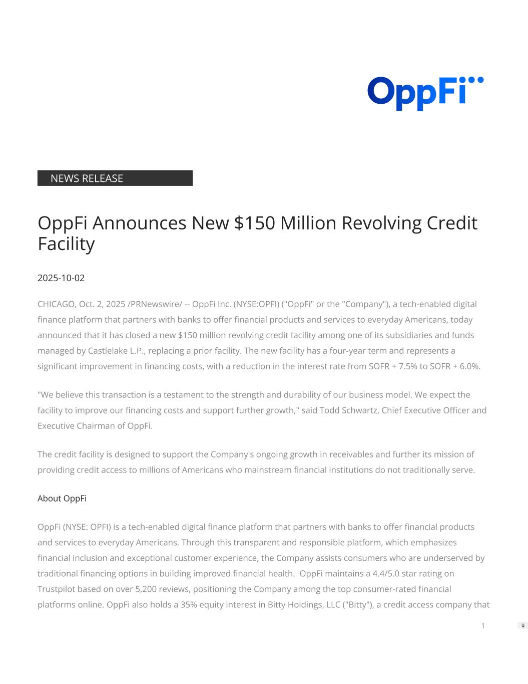 NEWS RELEASE OppFi Announces New $150 Million Revolving Credit Facility 2025-10-02 CHICAGO, Oct. 2, 2025 /PRNewswire/ -- OppFi Inc. (NYSE:OPFI) ("OppFi" or the "Company"), a tech-enabled digital nance platform that partners with banks to oer nancial products and services to everyday Americans, today announced that it has closed a new $150 million revolving credit facility among one of its subsidiaries and funds managed by Castlelake L.P., replacing a prior facility. The new facility has a four-year term and represents a signicant improvement in nancing costs, with a reduction in the interest rate from SOFR + 7.5% to SOFR + 6.0%. "We believe this transaction is a testament to the strength and durability of our business model. We expect the facility to improve our nancing costs and support further growth," said Todd Schwartz, Chief Executive Ocer and Executive Chairman of OppFi. The credit facility is designed to support the Company's ongoing growth in receivables and further its mission of providing credit access to millions of Americans who mainstream nancial institutions do not traditionally serve. About OppFi OppFi (NYSE: OPFI) is a tech-enabled digital nance platform that partners with banks to oer nancial products and services to everyday Americans. Through this transparent and responsible platform, which emphasizes nancial inclusion and exceptional customer experience, the Company assists consumers who are underserved by traditional nancing options in building improved nancial health. OppFi maintains a 4.4/5.0 star rating on Trustpilot based on over 5,200 reviews, positioning the Company among the top consumer-rated nancial platforms online. OppFi also holds a 35% equity interest in Bitty Holdings, LLC ("Bitty"), a credit access company that 1