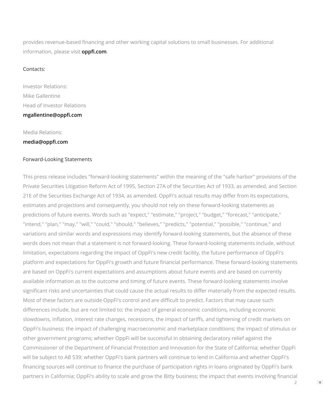 provides revenue-based nancing and other working capital solutions to small businesses. For additional information, please visit opp.com. Contacts: Investor Relations: Mike Gallentine Head of Investor Relations mgallentine@opp.com Media Relations: media@opp.com Forward-Looking Statements This press release includes "forward-looking statements" within the meaning of the "safe harbor" provisions of the Private Securities Litigation Reform Act of 1995, Section 27A of the Securities Act of 1933, as amended, and Section 21E of the Securities Exchange Act of 1934, as amended. OppFi's actual results may dier from its expectations, estimates and projections and consequently, you should not rely on these forward-looking statements as predictions of future events. Words such as "expect," "estimate," "project," "budget," "forecast," "anticipate," "intend," "plan," "may," "will," "could," "should," "believes," "predicts," "potential," "possible," "continue," and variations and similar words and expressions may identify forward-looking statements, but the absence of these words does not mean that a statement is not forward-looking. These forward-looking statements include, without limitation, expectations regarding the impact of OppFi's new credit facility, the future performance of OppFi's platform and expectations for OppFi's growth and future nancial performance. These forward-looking statements are based on OppFi's current expectations and assumptions about future events and are based on currently available information as to the outcome and timing of future events. These forward-looking statements involve signicant risks and uncertainties that could cause the actual results to dier materially from the expected results. Most of these factors are outside OppFi's control and are dicult to predict. Factors that may cause such dierences include, but are not limited to: the impact of general economic conditions, including economic slowdowns, ination, interest rate changes, recessions, the impact of taris, and tightening of credit markets on OppFi's business; the impact of challenging macroeconomic and marketplace conditions; the impact of stimulus or other government programs; whether OppFi will be successful in obtaining declaratory relief against the Commissioner of the Department of Financial Protection and Innovation for the State of California; whether OppFi will be subject to AB 539; whether OppFi's bank partners will continue to lend in California and whether OppFi's nancing sources will continue to nance the purchase of participation rights in loans originated by OppFi's bank partners in California; OppFi's ability to scale and grow the Bitty business; the impact that events involving nancial 2