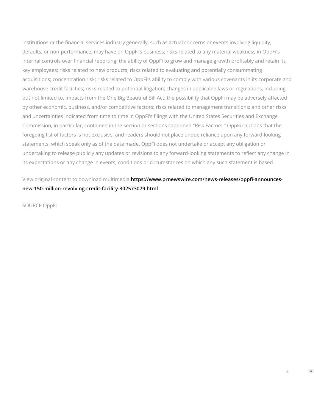 institutions or the nancial services industry generally, such as actual concerns or events involving liquidity, defaults, or non-performance, may have on OppFi's business; risks related to any material weakness in OppFi's internal controls over nancial reporting; the ability of OppFi to grow and manage growth protably and retain its key employees; risks related to new products; risks related to evaluating and potentially consummating acquisitions; concentration risk; risks related to OppFi's ability to comply with various covenants in its corporate and warehouse credit facilities; risks related to potential litigation; changes in applicable laws or regulations, including, but not limited to, impacts from the One Big Beautiful Bill Act; the possibility that OppFi may be adversely aected by other economic, business, and/or competitive factors; risks related to management transitions; and other risks and uncertainties indicated from time to time in OppFi's lings with the United States Securities and Exchange Commission, in particular, contained in the section or sections captioned "Risk Factors." OppFi cautions that the foregoing list of factors is not exclusive, and readers should not place undue reliance upon any forward-looking statements, which speak only as of the date made. OppFi does not undertake or accept any obligation or undertaking to release publicly any updates or revisions to any forward-looking statements to reect any change in its expectations or any change in events, conditions or circumstances on which any such statement is based. View original content to download multimedia:https://www.prnewswire.com/news-releases/opp-announces- new-150-million-revolving-credit-facility-302573079.html SOURCE OppFi 3