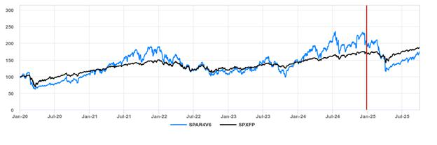 The graph below shows the performance, from January 1, 2020 through October 1, 2025, of the underlier and the S&P 500® Futures Excess Return Index.
