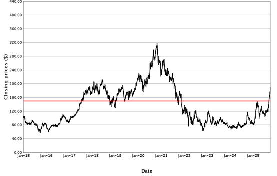 The following graph sets forth historical closing values of the Underlying for the period from January 1, 2015 to October 2, 2025. The solid line represents the Conversion Price. We obtained the information in the graph from Bloomberg Financial Markets, without independent investigation. The historical performance of the Underlying should not be taken as an indication of its future performance. We cannot give you assurance that the performance of the Underlying will result in the return of all of your initial investment.