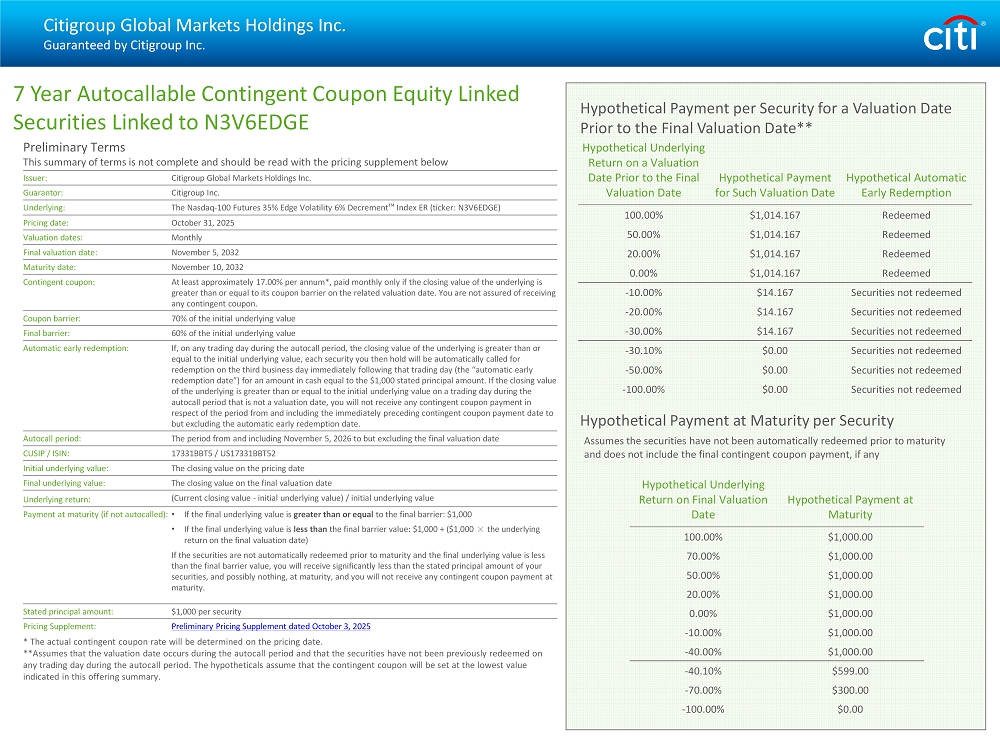 Preliminary Terms This summary of terms is not complete and should be read with the pricing supplement below Citigroup Global Markets Holdings Inc. Issuer: Citigroup Inc. Guarantor: The Nasdaq - 100 Futures 35% Edge Volatility 6% Decrement Index ER (ticker: N3V6EDGE) Underlying: October 31, 2025 Pricing date: Monthly Valuation dates: November 5, 2032 Final valuation date: November 10, 2032 Maturity date: At least approximately 17.00% per annum*, paid monthly only if the closing value of the underlying is greater than or equal to its coupon barrier on the related valuation date. You are not assured of receiving any contingent coupon. Contingent coupon: 70% of the initial underlying value Coupon barrier: 60% of the initial underlying value Final barrier: If, on any trading day during the autocall period, the closing value of the underlying is greater than or equal to the initial underlying value, each security you then hold will be automatically called for redemption on the third business day immediately following that trading day (the “automatic early redemption date”) for an amount in cash equal to the $1,000 stated principal amount. If the closing value of the underlying is greater than or equal to the initial underlying value on a trading day during the autocall period that is not a valuation date, you will not receive any contingent coupon payment in respect of the period from and including the immediately preceding contingent coupon payment date to but excluding the automatic early redemption date. Automatic early redemption: The period from and including November 5, 2026 to but excluding the final valuation date Autocall period: 17331BBT5 / US17331BBT52 CUSIP / ISIN: The closing value on the pricing date Initial underlying value: The closing value on the final valuation date Final underlying value: (Current closing value - initial underlying value) / initial underlying value Underlying return: • If the final underlying value is greater than or equal to the final barrier: $1,000 • If the final underlying value is less than the final barrier value: $1,000 + ($1,000 × the underlying return on the final valuation date) If the securities are not automatically redeemed prior to maturity and the final underlying value is less than the final barrier value, you will receive significantly less than the stated principal amount of your securities, and possibly nothing, at maturity, and you will not receive any contingent coupon payment at maturity. Payment at maturity (if not autocalled): $1,000 per security Stated principal amount: Preliminary Pricing Supplement dated October 3, 2025 Pricing Supplement: * The actual contingent coupon rate will be determined on the pricing date. **A ssumes that the valuation date occurs during the autocall period and that the securities have not been previously redeemed on any trading day during the autocall period. The hypotheticals assume that the contingent coupon will be set at the lowest val ue indicated in this offering summary. Citigroup Global Markets Holdings Inc. Guaranteed by Citigroup Inc. 7 Year Autocallable Contingent Coupon Equity Linked Securities Linked to N3V6EDGE Hypothetical Payment per Security for a Valuation Date Prior to the Final Valuation Date** Hypothetical Payment at Maturity Hypothetical Underlying Return on Final Valuation Date $1,000.00 100.00% $1,000.00 70.00% $1,000.00 50.00% $1,000.00 20.00% $1,000.00 0.00% $1,000.00 - 10.00% $1,000.00 - 40.00% $599.00 - 40.10% $300.00 - 70.00% $0.00 - 100.00% Assumes the securities have not been automatically redeemed prior to maturity and does not include the final contingent coupon payment, if any Hypothetical Automatic Early Redemption Hypothetical Payment for Such Valuation Date Hypothetical Underlying Return on a Valuation Date Prior to the Final Valuation Date Redeemed $1,014.167 100.00% Redeemed $1,014.167 50.00% Redeemed $1,014.167 20.00% Redeemed $1,014.167 0.00% Securities not redeemed $14.167 - 10.00% Securities not redeemed $14.167 - 20.00% Securities not redeemed $14.167 - 30.00% Securities not redeemed $0.00 - 30.10% Securities not redeemed $0.00 - 50.00% Securities not redeemed $0.00 - 100.00% Hypothetical Payment at Maturity per Security