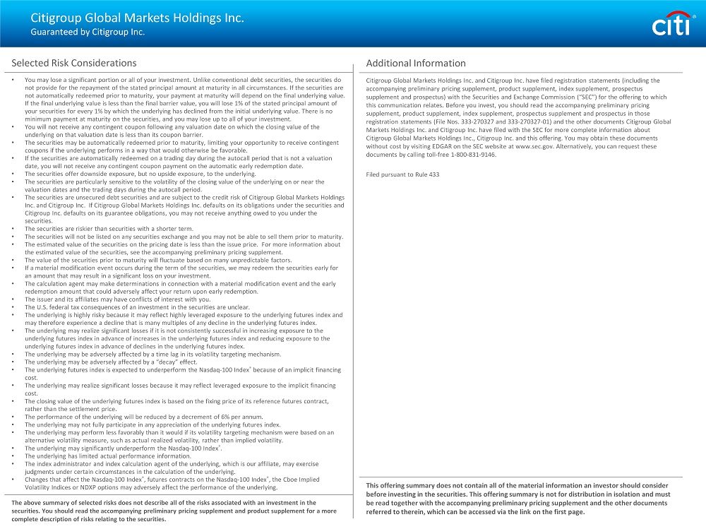 Selected Risk Considerations • You may lose a significant portion or all of your investment. Unlike conventional debt securities, the securities do not provide for the repayment of the stated principal amount at maturity in all circumstances. If the securities are not automatically redeemed prior to maturity, your payment at maturity will depend on the final underlying value. If the final underlying value is less than the final barrier value, you will lose 1% of the stated principal amount of your securities for every 1% by which the underlying has declined from the initial underlying value. There is no minimum payment at maturity on the securities, and you may lose up to all of your investment. • You will not receive any contingent coupon following any valuation date on which the closing value of the underlying on that valuation date is less than its coupon barrier. • The securities may be automatically redeemed prior to maturity, limiting your opportunity to receive contingent coupons if the underlying performs in a way that would otherwise be favorable. • If the securities are automatically redeemed on a trading day during the autocall period that is not a valuation date, you will not receive any contingent coupon payment on the automatic early redemption date. • The securities offer downside exposure, but no upside exposure, to the underlying. • The securities are particularly sensitive to the volatility of the closing value of the underlying on or near the valuation dates and the trading days during the autocall period. • The securities are unsecured debt securities and are subject to the credit risk of Citigroup Global Markets Holdings Inc. and Citigroup Inc. If Citigroup Global Markets Holdings Inc. defaults on its obligations under the securities and Citigroup Inc. defaults on its guarantee obligations, you may not receive anything owed to you under the securities. • The securities are riskier than securities with a shorter term. • The securities will not be listed on any securities exchange and you may not be able to sell them prior to maturity. • The estimated value of the securities on the pricing date is less than the issue price. For more information about the estimated value of the securities, see the accompanying preliminary pricing supplement. • The value of the securities prior to maturity will fluctuate based on many unpredictable factors. • If a material modification event occurs during the term of the securities, we may redeem the securities early for an amount that may result in a significant loss on your investment. • The calculation agent may make determinations in connection with a material modification event and the early redemption amount that could adversely affect your return upon early redemption. • The issuer and its affiliates may have conflicts of interest with you. • The U.S. federal tax consequences of an investment in the securities are unclear. • The underlying is highly risky because it may reflect highly leveraged exposure to the underlying futures index and may therefore experience a decline that is many multiples of any decline in the underlying futures index. • The underlying may realize significant losses if it is not consistently successful in increasing exposure to the underlying futures index in advance of increases in the underlying futures index and reducing exposure to the underlying futures index in advance of declines in the underlying futures index. • The underlying may be adversely affected by a time lag in its volatility targeting mechanism. • The underlying may be adversely affected by a “decay” effect. • The underlying futures index is expected to underperform the Nasdaq - 100 Index ® because of an implicit financing cost. • The underlying may realize significant losses because it may reflect leveraged exposure to the implicit financing cost. • The closing value of the underlying futures index is based on the fixing price of its reference futures contract, rather than the settlement price. • The performance of the underlying will be reduced by a decrement of 6% per annum. • The underlying may not fully participate in any appreciation of the underlying futures index. • The underlying may perform less favorably than it would if its volatility targeting mechanism were based on an alternative volatility measure, such as actual realized volatility, rather than implied volatility. • The underlying may significantly underperform the Nasdaq - 100 Index ® . • The underlying has limited actual performance information. • The index administrator and index calculation agent of the underlying, which is our affiliate, may exercise judgments under certain circumstances in the calculation of the underlying. • Changes that affect the Nasdaq - 100 Index ® , futures contracts on the Nasdaq - 100 Index ® , the Cboe Implied Volatility Indices or NDXP options may adversely affect the performance of the underlying. The above summary of selected risks does not describe all of the risks associated with an investment in the securities. You should read the accompanying preliminary pricing supplement and product supplement for a more complete description of risks relating to the securities. Additional Information Citigroup Global Markets Holdings Inc. and Citigroup Inc. have filed registration statements (including the accompanying preliminary pricing supplement, product supplement, index supplement, prospectus supplement and prospectus) with the Securities and Exchange Commission (“SEC”) for the offering to which this communication relates. Before you invest, you should read the accompanying preliminary pricing supplement, product supplement, index supplement, prospectus supplement and prospectus in those registration statements (File Nos. 333 - 270327 and 333 - 270327 - 01) and the other documents Citigroup Global Markets Holdings Inc. and Citigroup Inc. have filed with the SEC for more comp
