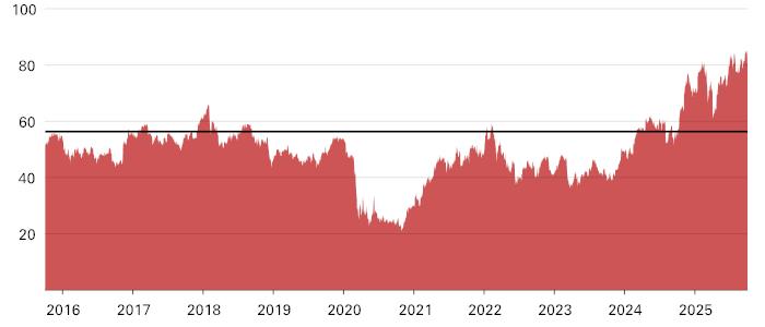 Wells Fargo & Company — Daily Closing Prices October 2, 2015 to October 2, 2025 |