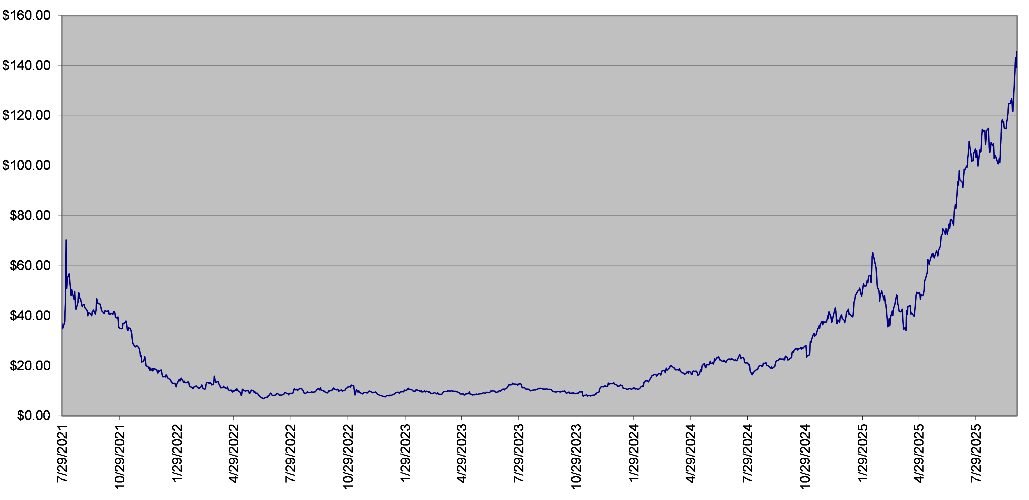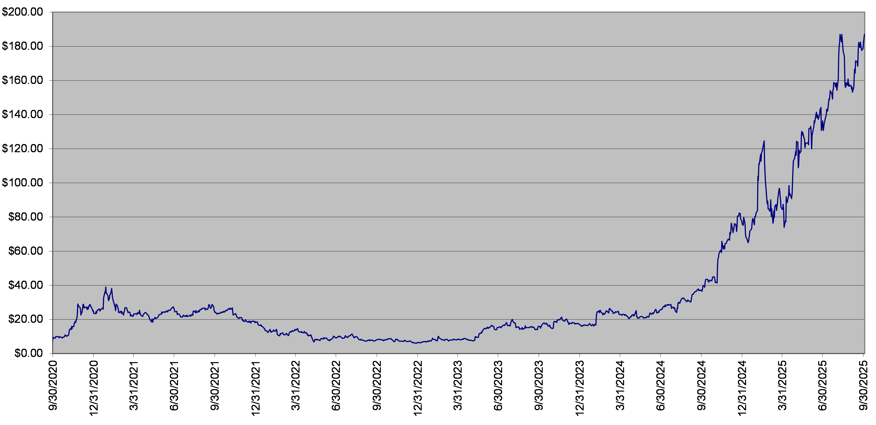 PLTR Stock Daily Closing Levels September 30, 2020* to October 2, 2025 |