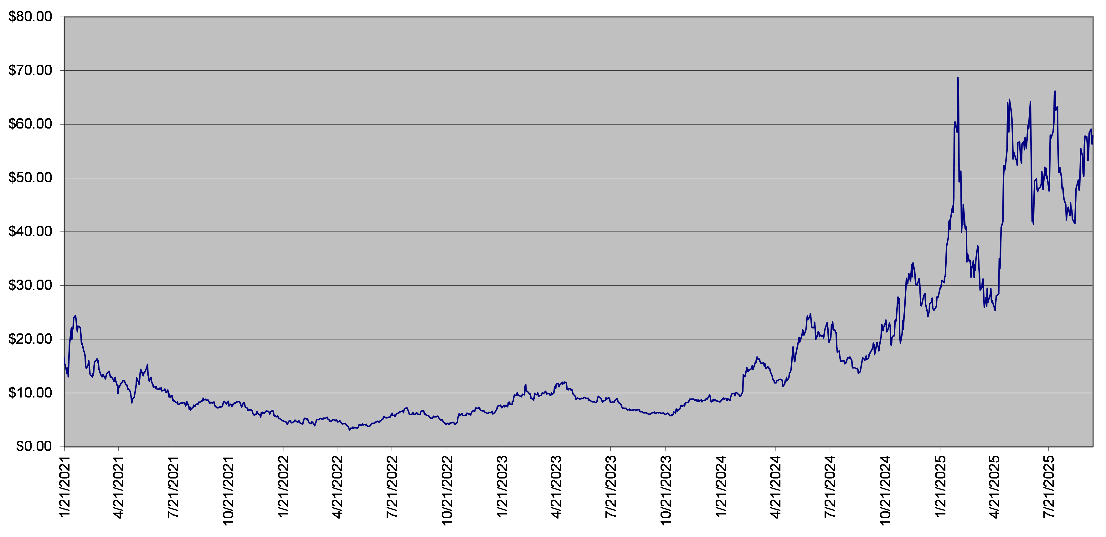 HIMS Stock Daily Closing Levels January 21, 2021* to October 2, 2025 |