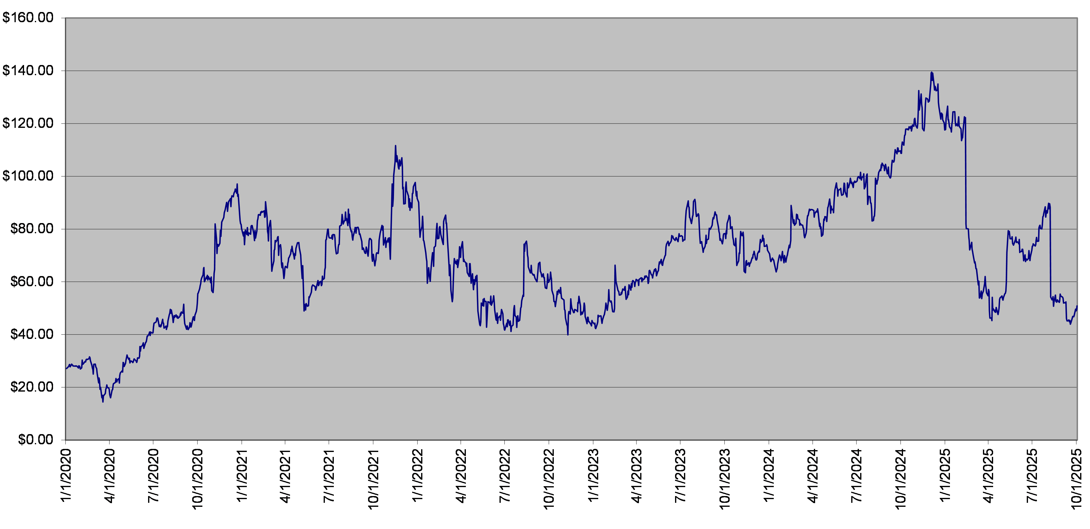 TTD Stock Daily Closing Levels January 1, 2020 to October 2, 2025 |