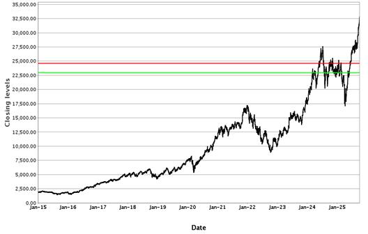 The red line represents a hypothetical Coupon Threshold and the green line represents a hypothetical Barrier Value, in each case based on the closing value of the Underlier on October 1, 2025. We obtained the information in the graph from Bloomberg Financial Markets, without independent investigation. We cannot give you assurance that the performance of the Underlier will result in the return of all of your initial investment.