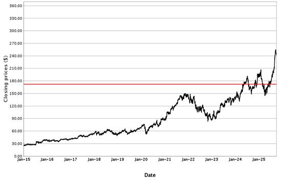 The following graph sets forth historical closing values of the Underlier for the period from January 1, 2015 to October 2, 2025. The red line represents a hypothetical Coupon Threshold and Barrier Value based on the closing value of the Underlier on October 2, 2025. We obtained the information in the graph from Bloomberg Financial Markets, without independent investigation. We cannot give you assurance that the performance of the Underlier will result in the return of all of your initial investment.