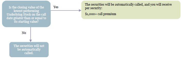 If the closing value of the lowest performing Underlying Stock on the call date is greater than or equal to its starting value, the securities will be automatically called, and on the call settlement date, you will be entitled to receive a cash payment per security in U.S. dollars equal to the face amount plus the call premium.