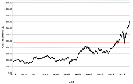 The following graph sets forth daily closing prices of the GS Stock for the period from January 1, 2015 to October 1, 2025. The closing price of the GS Stock on October 1, 2025 was $785.51. The red line represents a hypothetical threshold value based on the closing price of the GS Stock on October 1, 2025. The historical performance of the GS Stock should not be taken as an indication of the future performance of the GS Stock during the term of the securities.