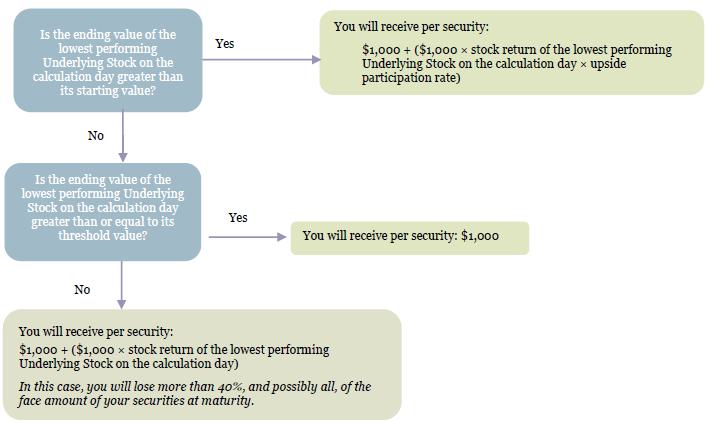 ■ | understand that if the securities are not automatically called prior to stated maturity, and the ending value of the lowest performing Underlying Stock on the calculation day is less than its threshold value, they will have full downside exposure to the decrease in the value of that Underlying Stock from its starting value, and they will lose more than 40%, and possibly all, of the face amount of their securities at maturity; |