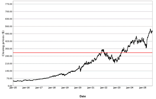 The following graph sets forth daily closing prices of the MSFT Stock for the period from January 1, 2015 to October 1, 2025. The closing price of the MSFT Stock on October 1, 2025 was $519.71. The red line represents a hypothetical threshold value based on the closing price of the MSFT Stock on October 1, 2025. The historical performance of the MSFT Stock should not be taken as an indication of the future performance of the MSFT Stock during the term of the securities.