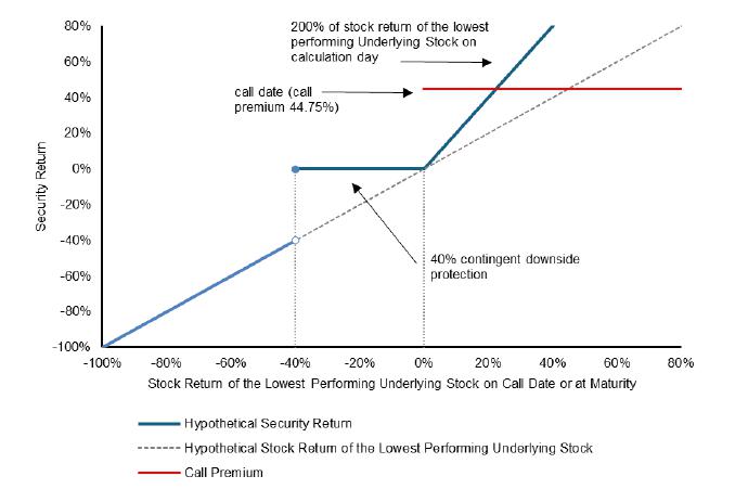 Because the hypothetical closing value of the lowest performing Underlying Stock on the call date is greater than its hypothetical starting value, the securities are automatically called on the call date and you will receive on the call settlement date the face amount of your securities plus a hypothetical call premium of 44.75% of the face amount. Even though the lowest performing Underlying Stock on the call date appreciated by 60% from its hypothetical starting value to its hypothetical closing value on the call date in this example, your return is limited to the hypothetical call premium of 44.75%.