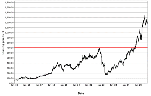 The following graph sets forth daily closing prices of the NFLX Stock for the period from January 1, 2015 to October 1, 2025. The closing price of the NFLX Stock on October 1, 2025 was $1,170.90. The red line represents a hypothetical threshold value based on the closing price of the NFLX Stock on October 1, 2025. The historical performance of the NFLX Stock should not be taken as an indication of the future performance of the NFLX Stock during the term of the securities.